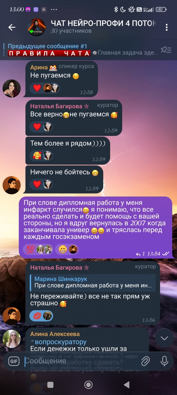 Это было очень круто, резко поменяла профессию, с юриста до смм, разобралась в нейросетях, научилась делать визуал с нуля, и вообще узнала много нового. Спикер Арина — просто бог в объяснении необъяснимого😆 спасибо ей и нашему куратору Наталье Багировой, отвечали на все!!! И быстро!!! И даже спикер наш, всегда разбиралась в твоих вопросах и проблемах до последнего, пока не решится она!!! Что очень ценно и круто) на последнем зуме, все расплакались😍 очень советую всем пройти такую школу!!