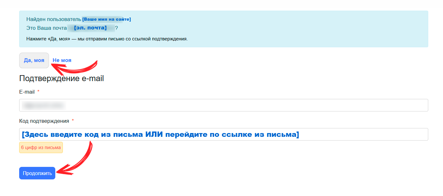 5. Если у вас уже есть зарегистрированный аккаунт, система найдет его. Вам нудно будет подтвердить свою почту способами, описанными в пункте выше, после того, как вы нажмете кнопку "Да, моя".