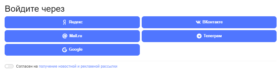 2. Далее во всплывающем окне необходимо выбрать один из удобных способов для авторизации – с помощью социальной сети VK, с помощью почтовых сервисов Яндекс, Google и Mail.ru или с помощью аккаунта в Telegram: